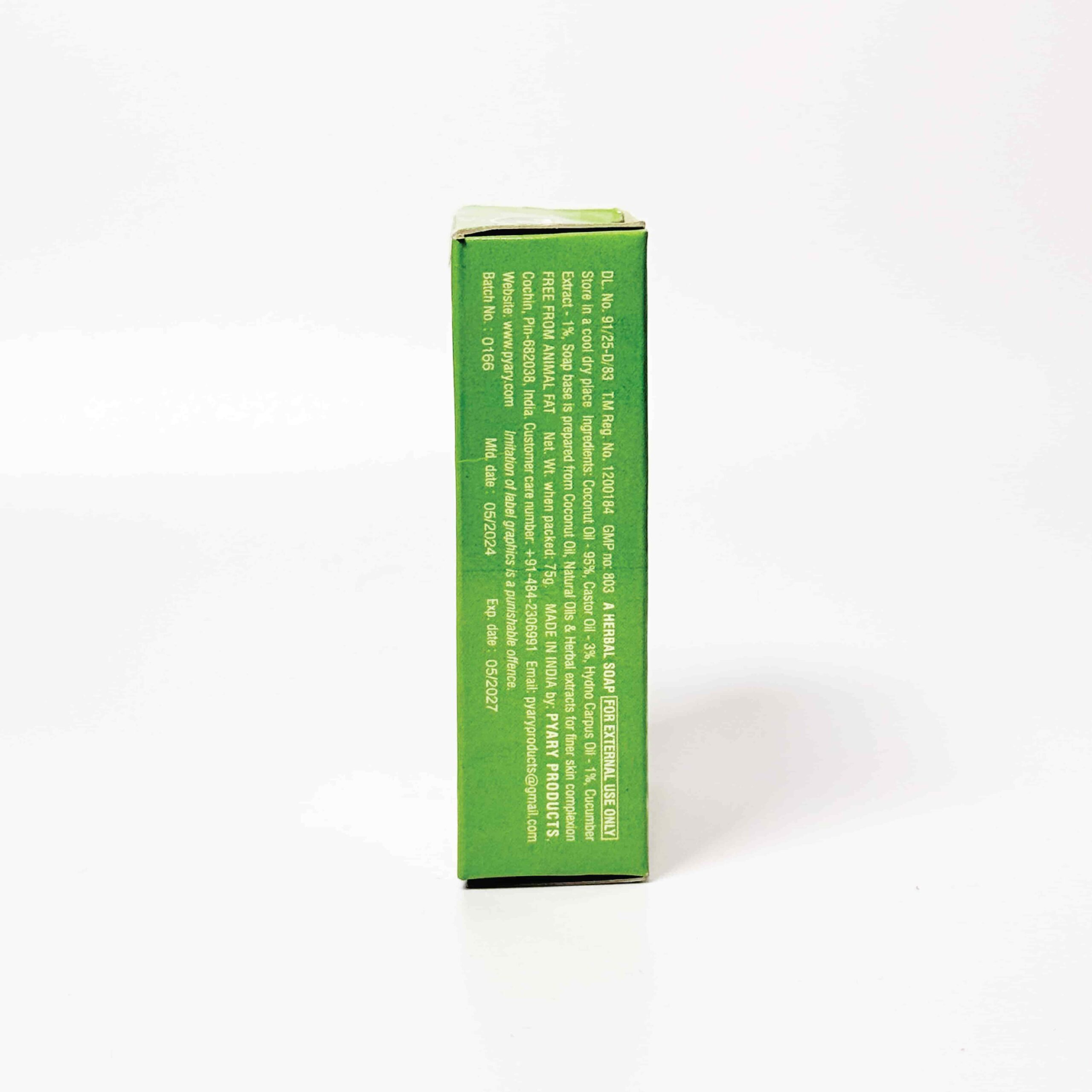 Pyary Herbal Soap is carefully crafted with pure coconut oil, enriched with herbal extracts, and infused with natural aromatic essential oils. Retaining all the glycerin formed during the soap-making process, this unique soap includes the essence of cucumber, a highly valued ingredient in the Indian indigenous system of medicine, known for its skin-refreshing properties. Cucumber is recognized for its natural brightening qualities and helps keep the skin fresh and beautiful, making it a preferred choice for daily cleansing. Pyary Soap with Cucumber provides excellent lather and gently cleanses the skin. With just one use, you can experience its refreshing and skin-nourishing benefits, helping maintain your skin’s natural beauty. Disclaimer: We believe that everyone has different skin types. Please perform a patch test first before applying it to your whole body.