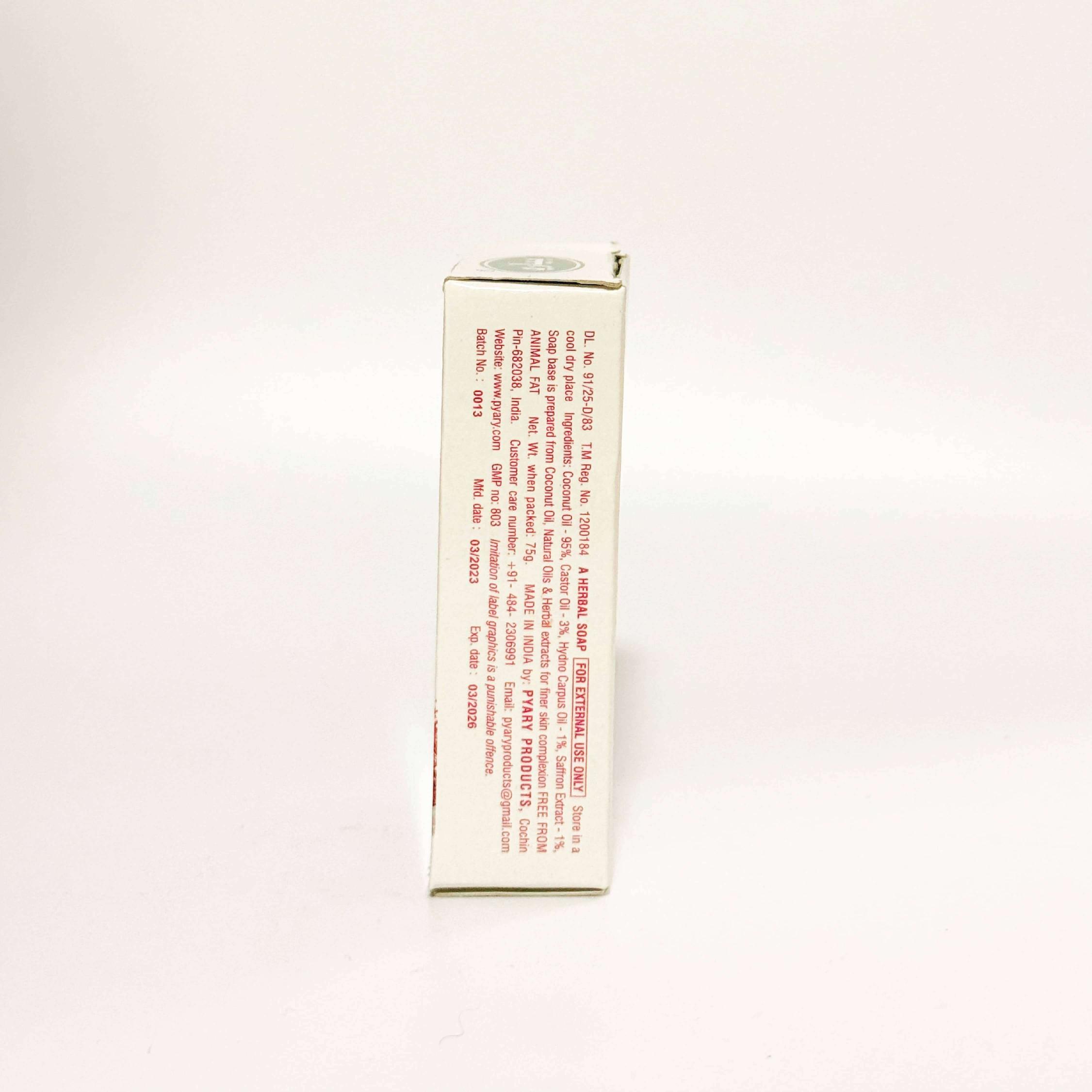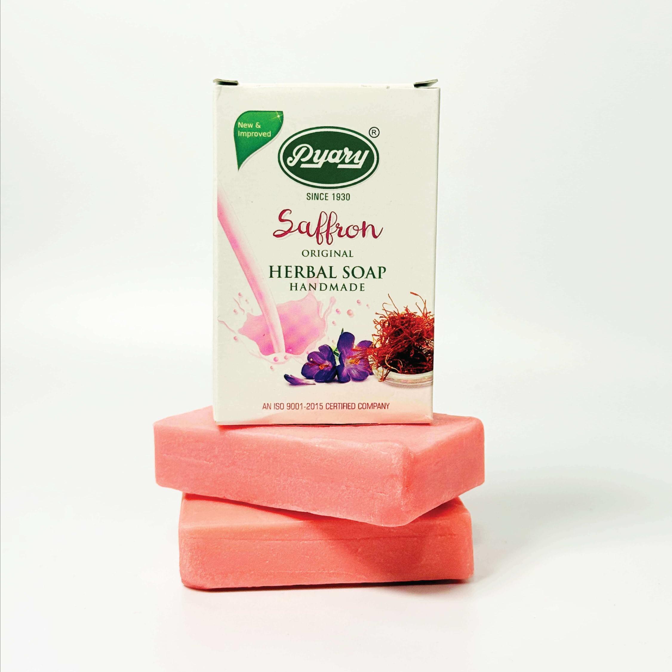 Pyary Saffron Herbal Soap is a traditional preparation made with pure coconut oil, natural aromatic essential oils, and saffron extract—known for promoting a finer skin complexion.